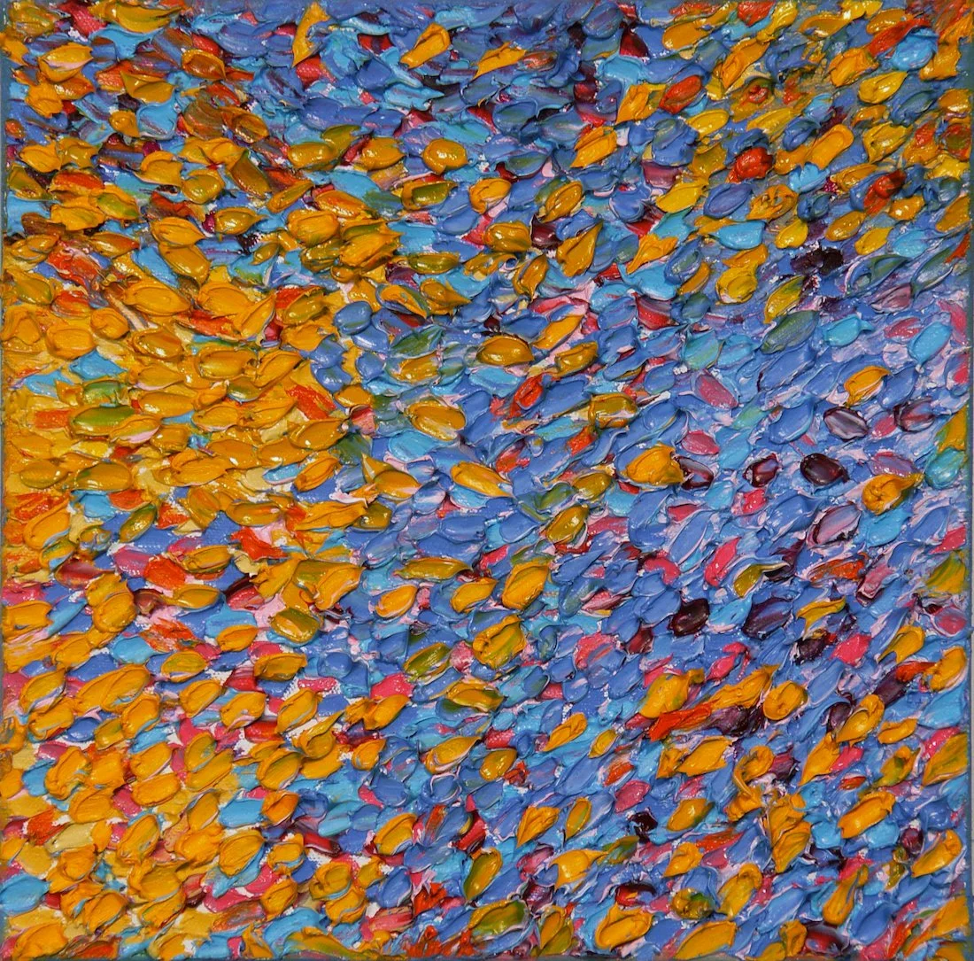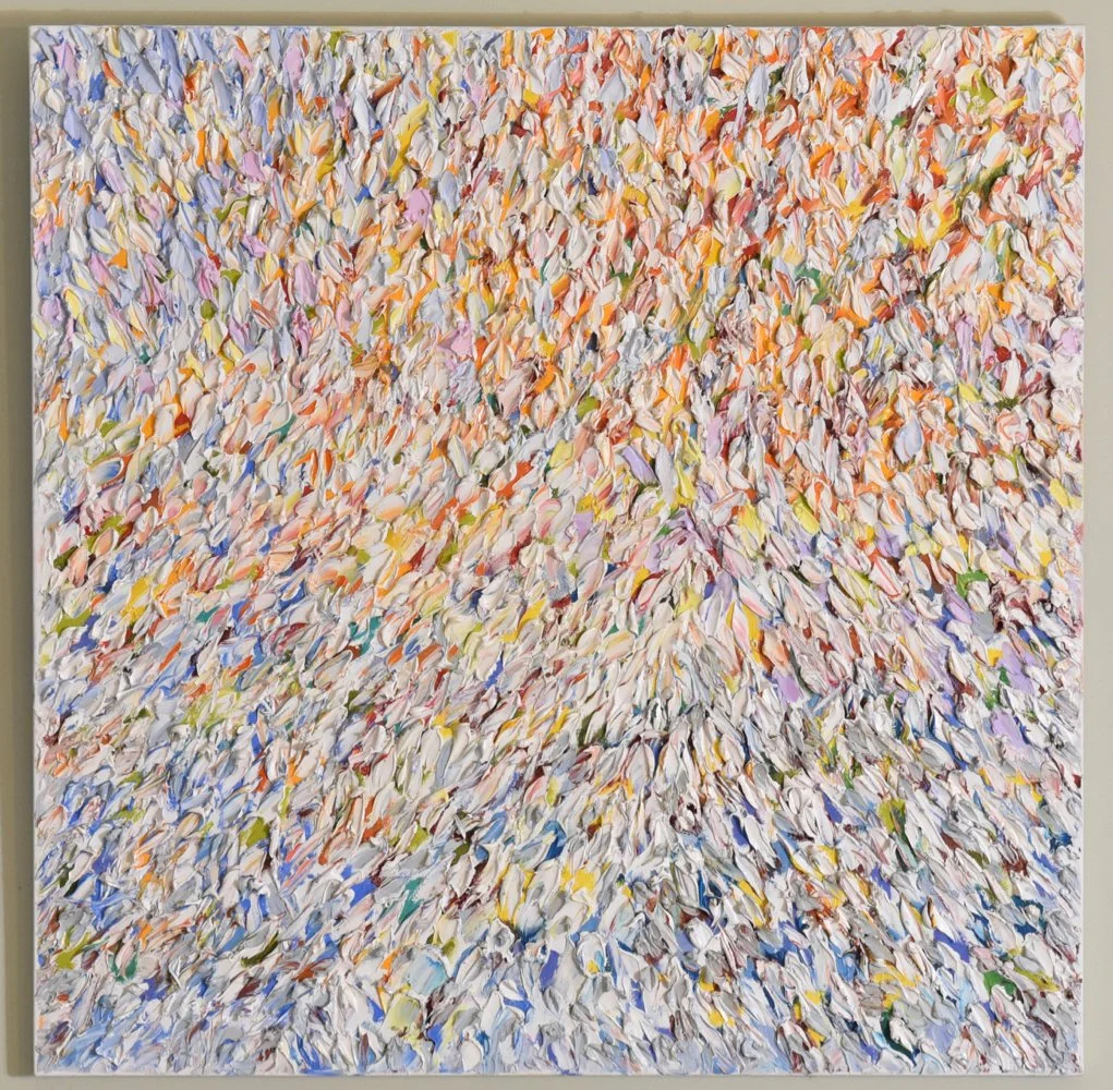 The 14-piece Ebb Series embodies this era on a grand scale. Created joyfully with thickly layered oil paint, the series was painted in Dian’s home studio on Cape Cod. The coastal landscape and emotional environment of this historic art region inform the movement, rhythm, and material depth of the work, making the series especially compelling for collectors and galleries seeking significant contemporary abstract art.