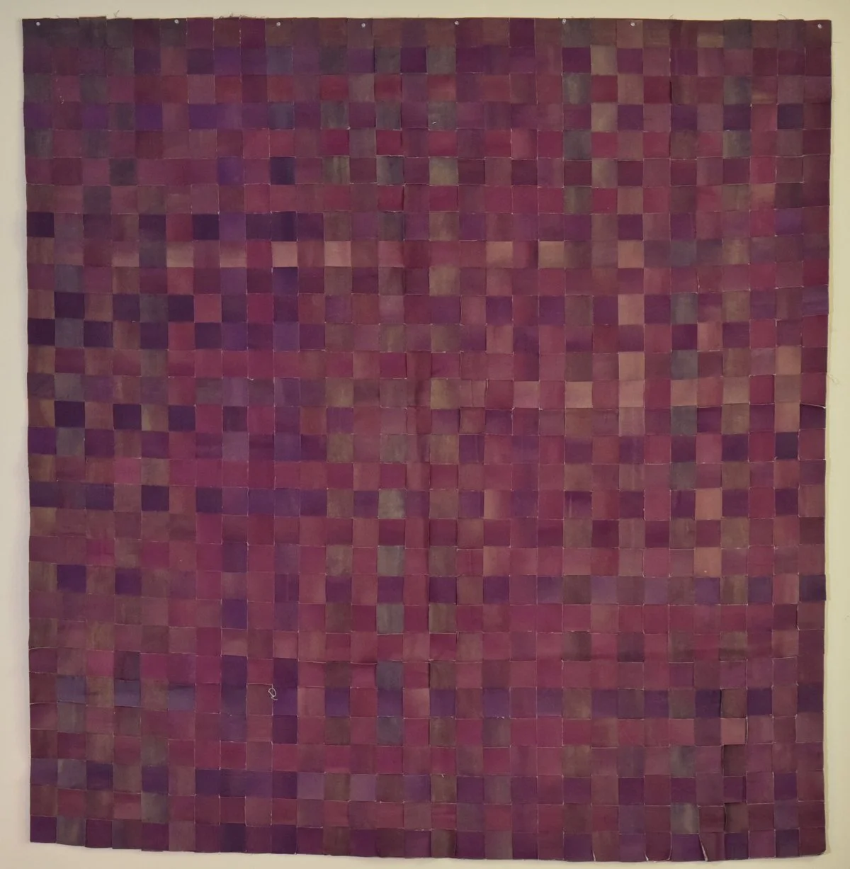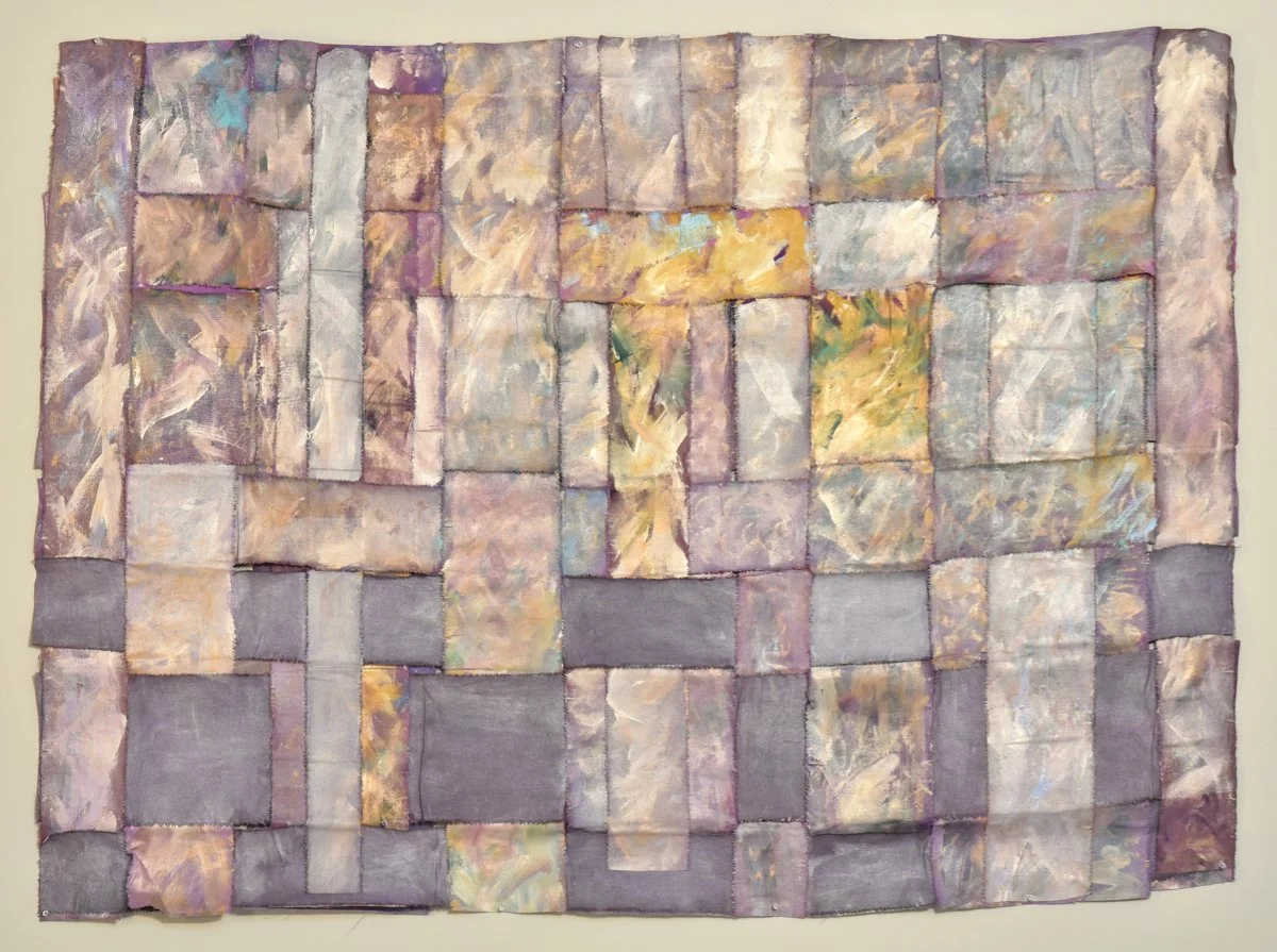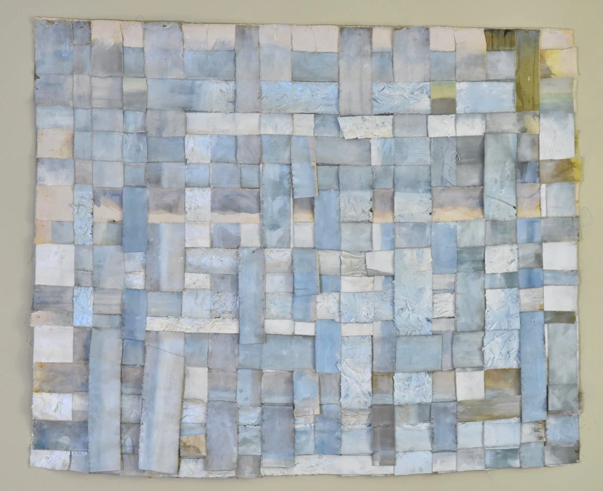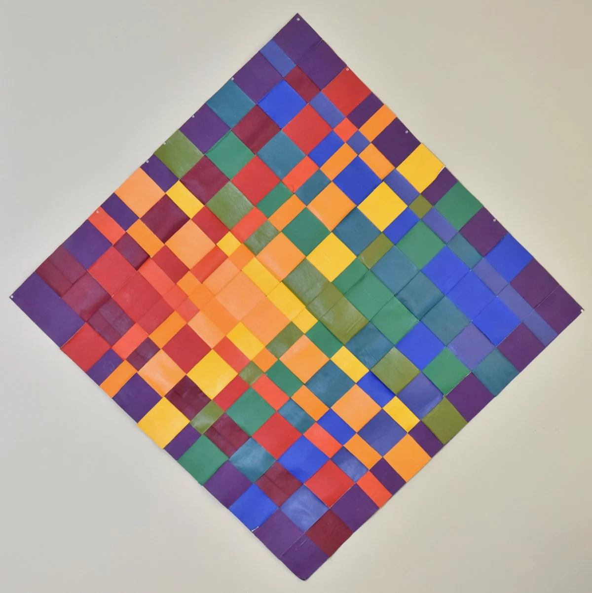 Dian’s woven canvas paintings from the 1980s through the 1990s reflect an early, exploratory phase of her abstract practice. During this period, she began experimenting with the physical construction of the canvas itself, interlacing and layering materials so that the structure, surface, and paint worked together as a single visual system. This style flows into her geometric canvas collages, also shared below. In both the woven and geometric collages, texture and repetition play central roles, creating compositions that emphasize rhythm, depth, and material presence.