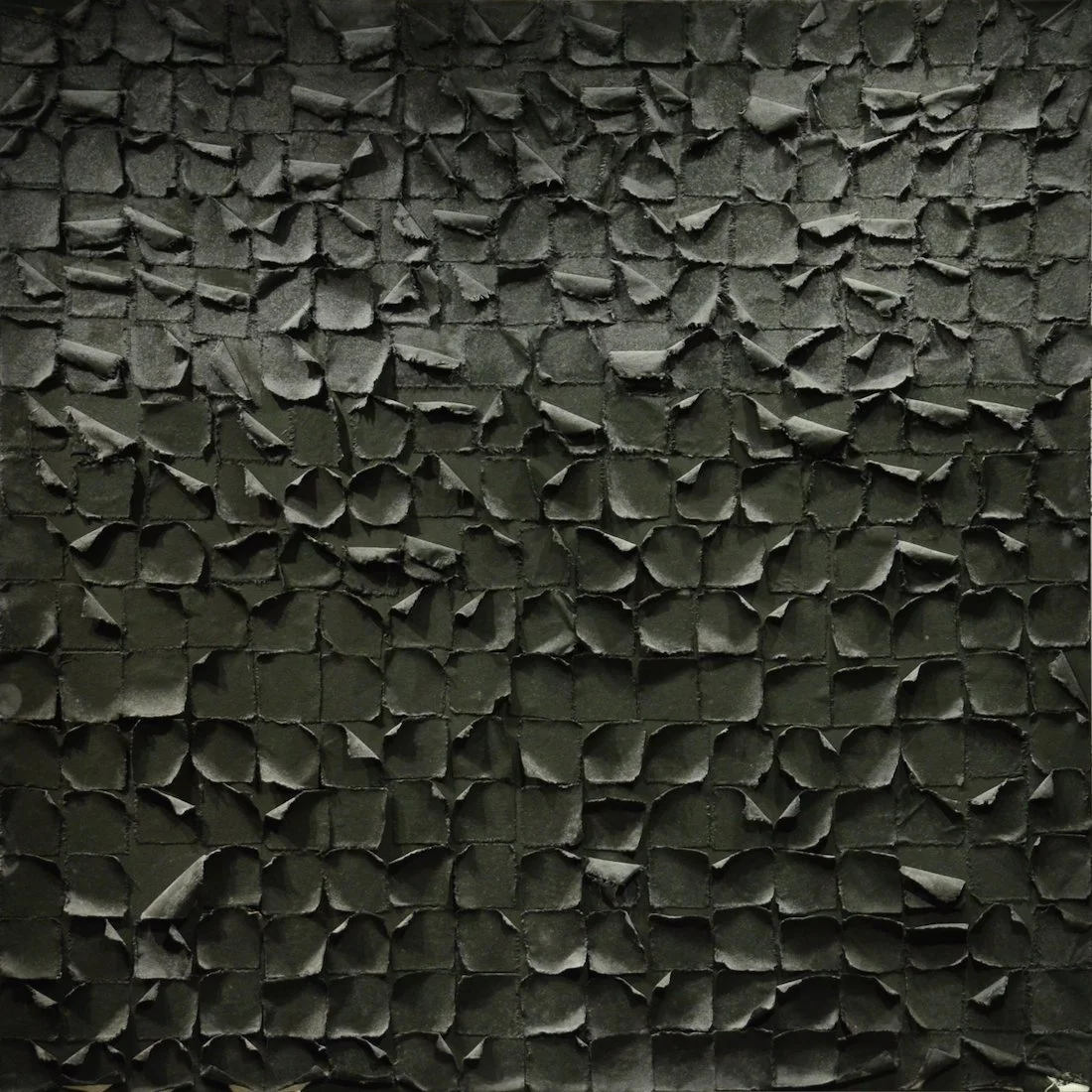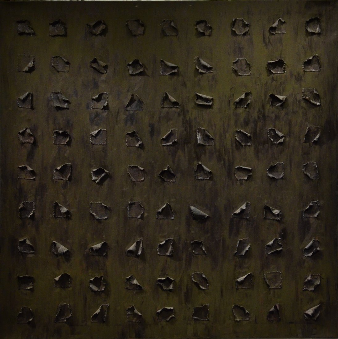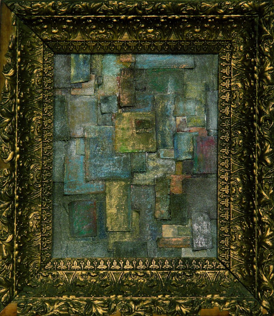 Dian’s woven canvas paintings from the 1980s through the 1990s reflect an early, exploratory phase of her abstract practice. During this period, she began experimenting with the physical construction of the canvas itself, interlacing and layering materials so that the structure, surface, and paint worked together as a single visual system. This style flows into her geometric canvas collages, also shared below. In both the woven and geometric collages, texture and repetition play central roles, creating compositions that emphasize rhythm, depth, and material presence.